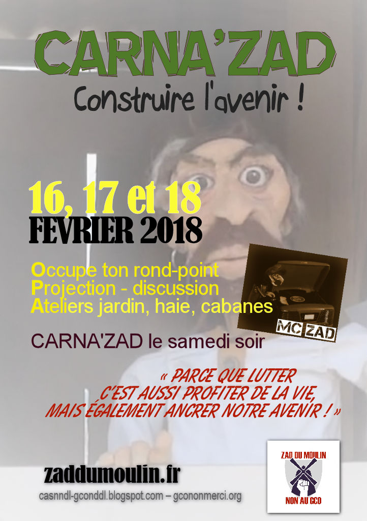 Le week-end des 16, 17 et 18 février 2018, des habitant.e.s de la zad du Moulin, des électrons libres et militant.e.s du mouvement anti GCO vous invitent à venir construire l’avenir sur la ZAD : ateliers et moments ludiques vous seront proposés.
