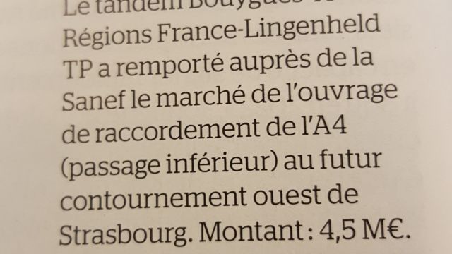 11h00 – action à prévoir contre Bouygue-Lingenheld. Le tandem remporte le marché pour la partie SANEF du projet GCO (échangeur nord de Vendenheim). Information transmise d’un article paru dans Le Moniteur du 15 juin. Pour mémoire/rappel, le président de Lingenheld est également le vice-président de la Chambre de Commerce et d’Industrie Alsace Eurométropole. Ce soir, à 17h, devant la CCI, on va pouvoir en causer.