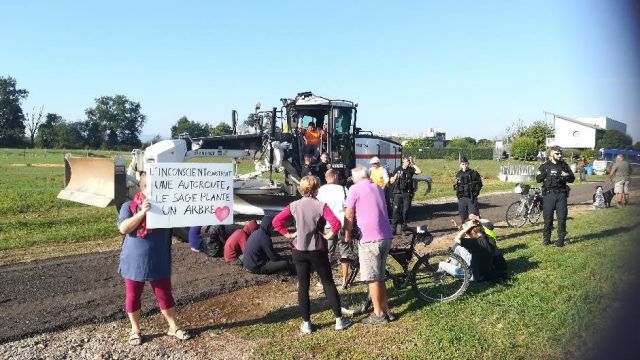 10h00min – on nous signale des gendarmes qui encadrent une grosse machine à Ernolsheim. Visiblement les ecocidaires n’ont pas décidé de faire cesser le bruit des tronçonneuses. Si vous êtes dans le coin n’hésitez pas à faire un saut (travaux du côté de la station d’épuration visiblement). Il s’agit pour l’instant de travaux de goudronnage de l’accès près de la station d’épuration. Pour faire passer des grosses machines ? Pour commencer à couler du béton ?