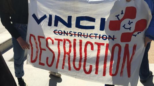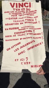 Le PDG de Vinci, initialement annoncé, n’est finalement pas venu. Le monsieur a-t-il pris peur d’être confronté à la réalité de son entreprise ? … Là, où il y a quelques jours, il pleurait dans une tribune à ne pas comprendre le « Vinci bashing » que subit sa société, notamment sur la probable acquisition-cadeau de ADP. Lire notre article ici. Finalement, la peur de notre présence est pour nous comme une petite victoire…