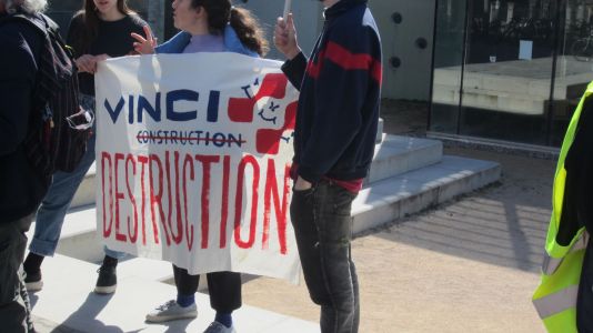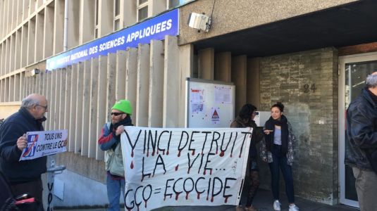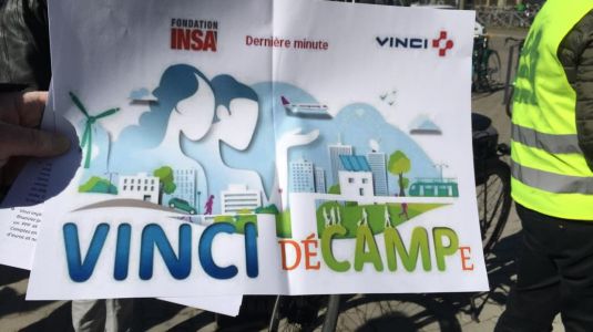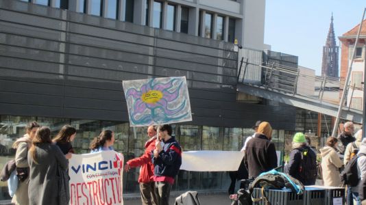 Ce jeudi matin, militant.es et zadistes étaient rassemblés devant l’INSA, boulevard de la Victoire, à Strasbourg, pour sensibiliser les étudiants à ne pas se laisser tromper par les propos de Vinci. De rétablir une certaine vérité sur ce qu’est l’entreprise. Le Monsanto du béton, un cancer pour notre environnement, lorsque l’on connaît la réalité climatique de notre planète.