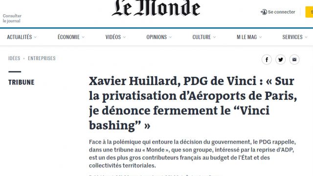 Face aux critiques sur la possible acquisition-cadeau des aéroports de Paris (ADP) par Vinci, son PDG, Xavier Huillard, tente de se justifier dans une tribune paru dans le journal Le Monde : « Sur la privatisation d’Aéroports de Paris, je dénonce fermement le “Vinci bashing” ». Le monsieur voudrait nous faire croire aux vertus de son entreprise, en oubliant au passage tout ce que lui rapportent les concessions et les moyens qu’use ses dirigeants pour y parvenir.